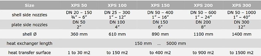Plate & Shell heat exchangers combine the, compact and countercurrnt, advantages of plate heat exchangers (Plate), coupled with the high pressure ratings of shell and tube heat exchaners provided by cylindrical shells (Shell). So, the best of both worlds. Heat transfer surfaces of 1 m² to 1000 m² enables thermal performance ranges from 10 kW all the way up to 100 MW (obviously dependant on the temperature driving force). The design parameters range from full vacuum to 400 bar (5,800 psi) and from -200 °C to 500 °C, so cryogenic LNG duties all the way to some gas turbine exhaust temperatures with everything else between.